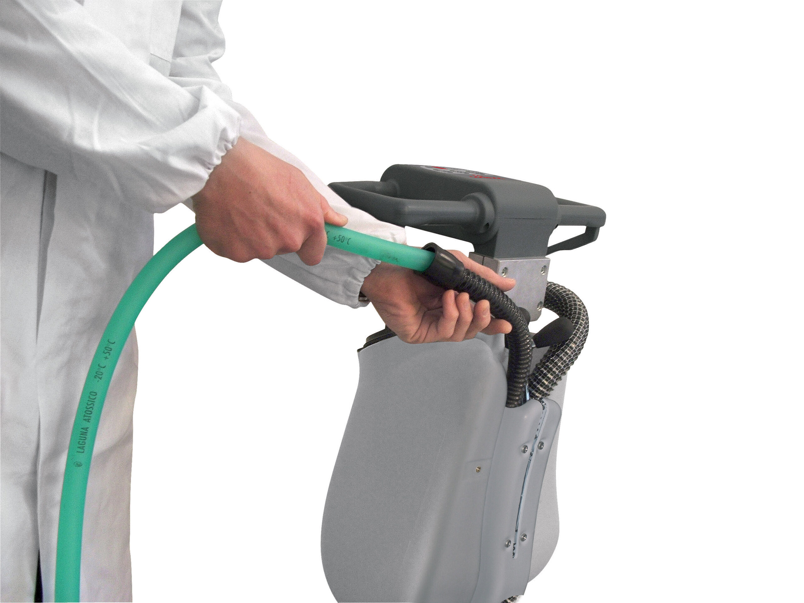Smuss samles opp i gjenvinningstanken som er enkel å fjerne, og enkel å tømme. Siden både rentvannstank og skittenvannstank enkelt kan fjernes, er det ikke noe problem å tømme, fylle på eller rengjøre den selv i små miljøer hvor det i utgangspunktet ikke er lagt til rette for rengjøring med gulvvaskemaskiner. Faktisk er det så enkelt at den kan rengjøres selv i en helt vanlig kjøkkenkrok. Sammenlignet med manuelle rengjøringssystemer som mopp og bøtter øker denne gulvvaskemaskinen operatørens produktivitet med 30 prosent.